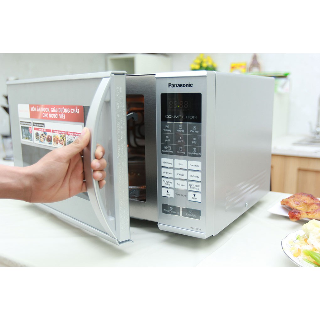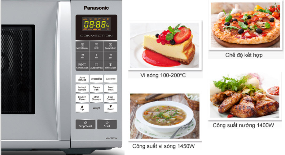 Lò Vi Sóng PANASONIC NN-CT655MYUE được thiết lập 4 chức năng là hâm nóng, nấu, rã đông, nướng, công suất vi sóng tối đa 900 W, công suất nướng 1400 W cùng 13 thực đơn tự động giúp bạn chế biến món ăn cho gia đình phong phú, thay đổi thực đơn mỗi ngày.