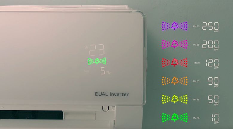 Máy lạnh được trang bị màn hình LED nằm ẩn dưới thân máy dàn lạnh, không chỉ tạo nên điểm nhấn tinh tế, sang trọng mà còn giúp bạn dễ dàng quan sát nhiệt độ, thông tin về chất lượng không khí và nồng độ bụi theo màu sắc ở từng cấp độ khác nhau.