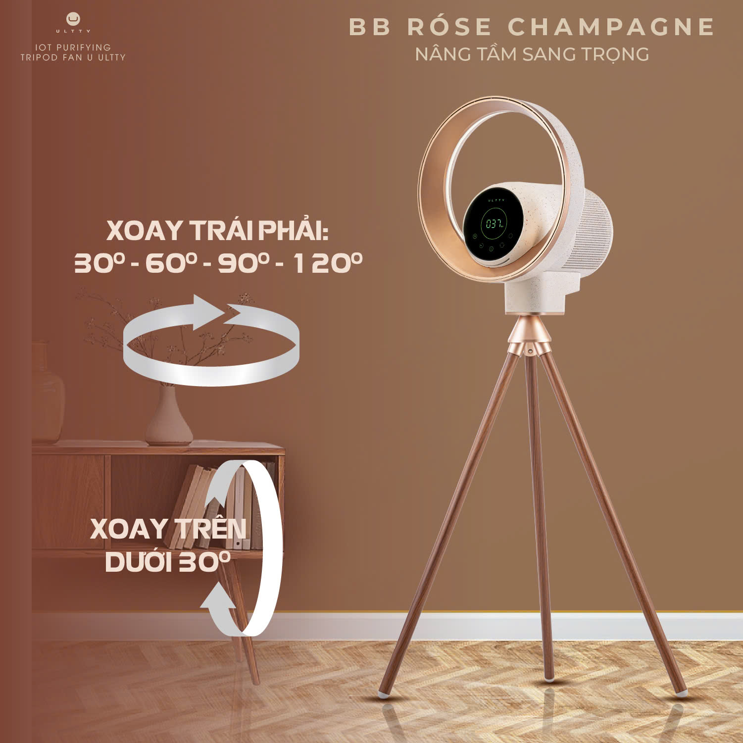 - ULTTY BB được thiết kế với biên độ quay trái – phải tùy chỉnh 4 cấp độ: 30°, 60°, 90° và 120°, dễ dàng điều chỉnh theo diện tích và nhu cầu sử dụng.