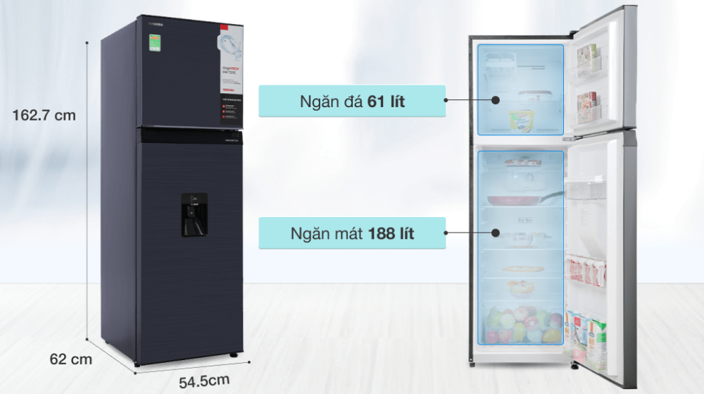 Với dung tích đến 249 lít gồm ngăn đá 61 lít và ngăn lạnh 188 lít, cùng tích hợp kính chịu lực các ngăn, giúp bạn thoải mái trữ thực phẩm thật tiện lợi. Đồng thời dung tích này hoàn toàn phù hợp cho gia đình có từ 2-3 thành viên.